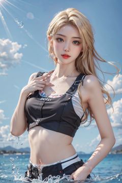 Best quality,masterpiece,ultra high res,water,light blonde,,upper body,lederhosen,on stomach,