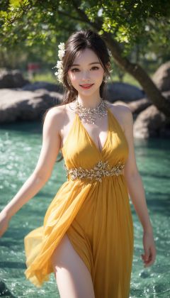Best quality, masterpiece, high-level, 4k, 1Girl, ultra detailed, surreal, highly detailed CG illustrations, official art, film light, realistic, young and beautiful girl, perfect figure, walking, smiling, yellow flower dress, confident, looking up, walking in the water, sexy figure, sexy legs, red lips, high cold, very detailed face, extremely detailed skin texture