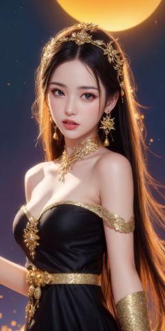 ((Half body photo)), facial close-up of a girl, long hair, gold headdress, gold earrings, gold streamers, off shoulder, (black dress, black dress), dark lines, gold decorations, sun, moon, holy, orange light, starry sky, night sky, cosmic background, goddess, beauty, clear eyes, correct hand painting, correct body painting
