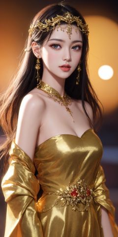 ((Half body photo)), facial close-up of a girl, long hair, gold headdress, gold earrings, gold streamers, off shoulder, (black dress, black dress), dark lines, gold decorations, sun, moon, holy, orange light, starry sky, night sky, cosmic background, goddess, beauty, clear eyes, correct hand painting, correct body painting