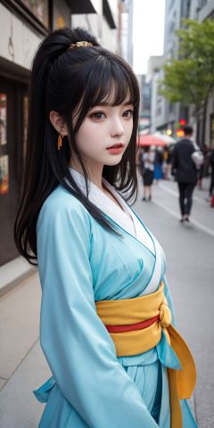 National style photo, (Hanfu: 1.3), (Film size: 1.1), 1 girl, beautiful details of eyes and face, masterpiece, best quality, panoramic, street shot, city center,