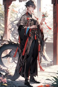 , (masterpiece:1.2), best quality,PIXIV,midjourney portrait,long hair, hanfu, 1boy, flower, male focus, chinese clothes, holding, jewelry, full body, earrings, white flower, long sleeves, standing, tassel, wide sleeves, dragon, solo, black hair, parted bangs, very long hair, grey hair, multicolored hair, holding flower, looking at viewer, tassel earrings, closed mouth, bangs, white hair <lora:midjourney portrait_20230625143136-000018:0.9>