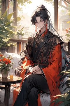, (masterpiece:1.2), best quality,PIXIV,midjourney portrait,long hair, hanfu, multiple boys, red flower, sitting, flower, black hair, chinese clothes, long sleeves, male focus, table, holding, window, jewelry, ponytail, looking at viewer, wide sleeves, very long hair, lattice, solo focus, indoors, earrings, hair ornament, vase, book, plant, robe, bangs, tassel, closed mouth, crossed legs <lora:midjourney portrait_20230625143136:0.9>