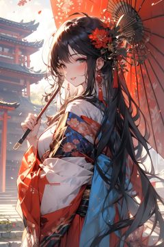 , (masterpiece:1.2), best quality,PIXIV,midjourney portrait,long hair, hair ornament, black hair, multiple girls, east asian architecture, architecture, looking at viewer, flower, hair flower, holding, japanese clothes, outdoors, hand fan, red flower, bangs, very long hair, blush, wide sleeves, holding fan, parted lips, smile, solo focus, long sleeves, kimono, umbrella, 3girls, stairs, multiple boys, shrine <lora:midjourney portrait_20230625143136:0.9>