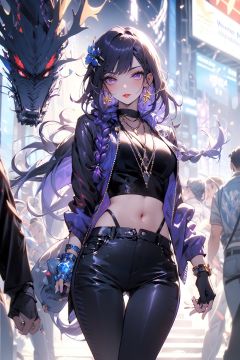 , (masterpiece:1.2), best quality,PIXIV,midjourney portrait,braid, jewelry, long hair, 1girl, purple eyes, bracelet, earrings, gloves, purple hair, solo focus, hair ornament, looking at viewer, breasts, black gloves, parted lips, fingerless gloves, black pants, jacket, fishnets, crowd, pants, braided ponytail, bag, ring, single braid, long sleeves, holding, cowboy shot, bangs, red lips, necklace<lora:midjourney portrait_20230625143136:0.9>