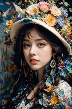bj_Alice,1girl,full body,Clean face,Smooth face,Long black hair,jewelry,flower,earrings,parted_lips,makeup,rose,bird,white headwear,white_flower,building,portrait,blue flower,yellow flower,hat flower,red lips,orange flower,cinematic lighting,strong contrast,romantic realism style,high level of detail,(dreamlike scenes),<lora:bj_Alice:0.7>,