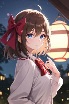 1girl, bangs, blue eyes, blurry, blurry background, bow, brown hair, closed mouth, from side, hair between eyes, hair bow, lantern, light particles, long sleeves, looking at viewer, medium hair, night, red bow, solo, star \(symbol\), upper body,(masterpiece:1.4),(best quality:1.4)