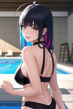 1girl, ahoge, bangs, bare arms, bare shoulders, bikini, black bikini, black choker, blue hair, blunt bangs, breasts, choker, colored inner hair, ear piercing, earrings, grey eyes, grey hair, indoors, jewelry, large breasts, long hair, looking at viewer, looking back, mole, mole under eye, multicolored hair, nail polish, parted lips, piercing, pool, smile, solo, swimsuit, upper body, water, wet,(masterpiece:1.4),(best quality:1.4),(shiny skin),realistic