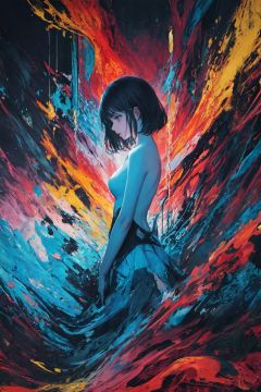 masterpiece, best quality, ultra high res, 1girl, (abstract art:1.4), bleeding blue, blue theme, visually stunning, beautiful, evocative, emotional, side view