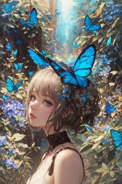 masterpiece, best quality, ultra high res, beautiful, visually stunning, gorgeous, evocative, (abstract art:1.4), 1girl, (blue butterflies, flowers:1.2),
