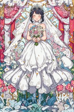 A radiant bride on her wedding day, emanating grace and happiness. Her flowing white gown cascades down to the ground, adorned with intricate lace and delicate embroidery. She wears a veil that partially covers her face, adding an air of mystery and anticipation. The scene is set in a picturesque garden, with blooming flowers in vibrant colors, creating a charming backdrop. The artwork portrays a romantic and timeless atmosphere, capturing the beauty and joy of the bride. (romantic, timeless style:1.1), flowing white gown, intricate lace and embroidery, veil, picturesque garden, blooming flowers, radiant bride