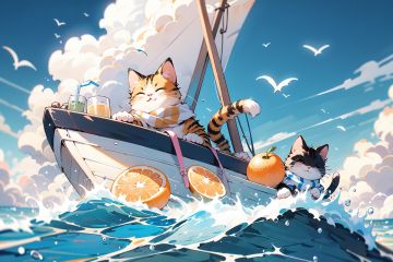 ,(Masterpiece:1.2, high quality),outdoors, drinking glass, no humans, cup, ocean, sky, day, cloud, fruit, watercraft, closed eyes, drink, cat, holding, orange (fruit), boat, food, sitting, scarf, beach, blue scarf, blue sky, water, holding cup, cocktail glass, animal, solo, horizon <lora:cat_20230627113759:0.8>
