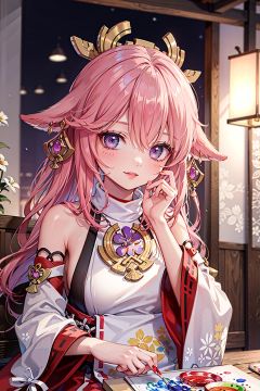 1girl, (ulzzang-6500:0.7), kpop idol, yae miko, detached sleeves, bare shoulders, pink hair, long hair, japanese clothes, best quality, (painting:1.5), (hair ornament:1.35), jewelry, purple eyes, earrings, breasts, torii, cherry blossoms, lantern light, depth of field, detailed face, face focus, ribbon_trim, (looking at viewer:1.25), nontraditional miko, shiny skin, long sleeves, smile, thick lips, game cg, hands on lips, east asian architecture, (blurry background:1.2), sitting, upper body, ,loli,petety,masterpiece,best quality