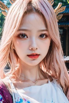 1girl, (ulzzang-6500:0.7), kpop idol, yae miko, detached sleeves, bare shoulders, pink hair, long hair, japanese clothes, best quality, (painting:1.5), (hair ornament:1.35), jewelry, purple eyes, earrings, breasts, torii,  cherry blossoms,  lantern light, depth of field, detailed face, face focus, ribbon_trim, (looking at viewer:1.25), nontraditional miko, shiny skin, long sleeves, smile, thick lips, game cg, hands on lips, east asian architecture, (blurry background:1.2), sitting, upper body, ,loli,petety,masterpiece,best quality,真实,照片