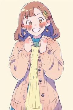 1girl, brown hair, yellow background, solo, dress, brown eyes, smile, earrings, braid, long sleeves, jewelry, simple background, cardigan, open mouth, looking at viewer, ribbon, hair ribbon, cable knit, leaf, yellow dress, sweater, blush, hair rings, yellow theme, aran sweater, print dress, <lora:kkk:1>