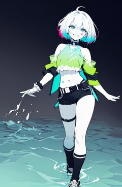 (((best quality)), ((ultra detailed)), ((masterpiece)), illustration,(oasis),(lakes),(detailed clear background),(clear background),(detailed light),lighting,(clear sky),night,stars,starry sky,moon light,(detailed clear water-drop:1.1),(ripple:1.1),(lake:1.1),((Colorful aurora)),1girl, solo, ((full body)),(detailed face), highest details, medium hair, messy hair, watery eyes, two-tone hair, gradient hair, multicolored scrunchie black cropped jacket,Complex headwear,bare shoulders, cutout above navel, detached sleeves, puffy short sleeves, black shorts, black belt, over-kneehighs, sneakers, arms at sides, Walking slowly on the water,head tilt, light smile,light rays, (high contrast),(((Colored paint background)))