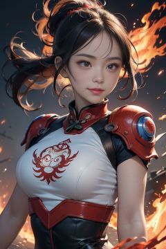 (masterpiece),(best quality),(ultra-detailed),(illustration),(disheveled hair),(photo_medium),Chinese element,1 Girl,Mecha,Red and blue and white,upper body,Detailed mech originals,Chinese knot,Black hair,Brown eyes,smile,Vermilion bird,flame,battle tendency,motion blur,