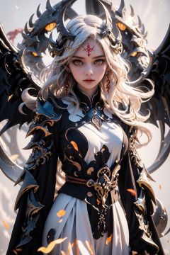 bj_Devil_angel, 1girl, solo, long hair, breasts, looking at_viewer, hair ornament, dress, jewelry, closed mouth, upper body, white hair, earrings, wings, white dress, armor, orange eyes, tassel, forehead mark,cinematic lighting,strong contrast,high level of detail,Best quality,masterpiece,White background,<lora:Devil_angel:0.7>,