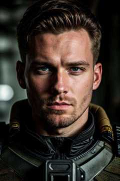 sci-fi, closeup portrait photo of man Joseph Mills in combat clothes, face, 8k uhd, high quality, film grain