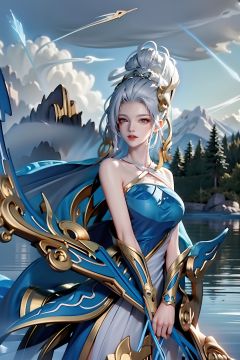 (((veil))),taihua, 1girl, bow (weapon), weapon, solo, high heels, long hair, white hair, dress, arrow (projectile), closed eyes, holding, holding weapon, holding bow (weapon), water, hair ornament,,arrow (projectile),white hair, jewelry, mask,upper body,  ,blue eyes, (((serious))), mountain background,ultra realistic,Sony Alpha α7,Mist,puffy clouds,proportionate,white lipstick,