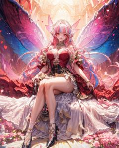 (masterpiece), (realistic), (best quality), (ultra-detailed),  amazing, ((fairy of love, red eyes, lace wings, intricate fairy-tale outfit , shoes with hearts, very long white hair with pink strands, multicolored hair, dreamy smile)))), cinematic light, unusual angle and pose,)),