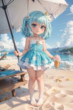 1Girl, (masterpiece, high definition, best quality: 1.5), smile, ice cream in a cup, ice cream in hand, cute swimming ring, excellent detail handling, handle hand details in place, beautiful ice cream, transparent, hawaii, beach, spin, seabird, (beach deck chair), (beach umbrella), white pantyhose, children, 32k