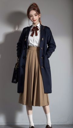 1girl, solo, coat, long hair, brown footwear, skirt, standing, white skirt, full body, ponytail, grey background, simple background, brown coat, socks, bag, shoes, scrunchie, long sleeves, looking at viewer, shirt, white socks, hair ornament, orange hair, high ponytail, green eyes, very long hair, collared shirt, closed mouth, lips, smile, open coat, long skirt, red hair, brown hair, white scrunchie, neck ribbon, shoulder bag, brown eyes, bow,(pureerosface_v1:0.5),( ulzzang-6500:0.6), <lora:keairichang-000012:0.8>