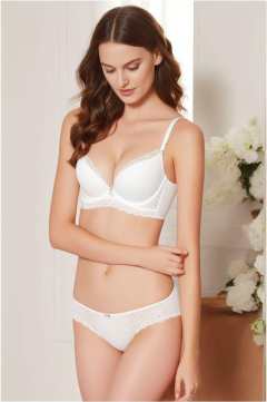 <lora:bodypops2:0.7>, The model is wearing a white bralette with lace detailing and matching panties. Her hair is tied up into a bun while she poses seductively for the camera.
