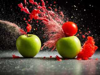 a green apple with a bite taken out of it, slow - mo high speed photography, high speed photography, high-speed sports photography, super high speed photography, spectacular splatter explosion, tomato splatter, high speed shutter, high speed camera, amazing food photography, culinary art photography, fast shutter speed, flowers exploding and spraying, styled food photography, by William Berra