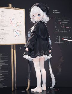 <lora:881:1:1,0,0,0,1,1,1,1,1,1,1,1,0,0,0,0,0>//[(simple background:1.5)::5], (imid shot:0.95), (full body:1.25),//(setting diagram,character design drawing, character profile, reference sheet,(all clothes configuration:1.15),revealing clothes, (infographic:1.2),(mathematical formula, number:1.2)best quality, masterpiece, highres, original, from behind, ((white background)),huge white canvas with easel, wide shot,1girl, solo, loli, (white hair, sliver hair), slightly curly hair, (cute beret hat),blue eyes, detailed face and eyes,wearing (black_capelet) and simple black coat, long wide sleeves, very_long_dress, no shoes,she is painting on canvas