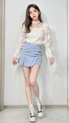 best quality,masterpiece,a beautiful young woman,18yo,solo,shirt,Figure like a female model,(full body),standing,posing,white skin,(huge thighs:1.2),highly detailed,VOGUE,character concept art,many details,high quality,8K,simple background,Front lighting,soft_lighting,The background is a white wall.,Desai_duo_ba_an,<lora:DuoBaAn:1:CLOTHING>,yellow shirt,brown shorts,pink skirt,white shoe,single shoe,puffy sleeves,sneakers,Puffy Skirt,Pleated Design,gold jewelry,Lace Paneling,Collar Detail,Bow Accents,High-low Skirt,<lora:aj_sneaker:0.6>,Tilt one's head,