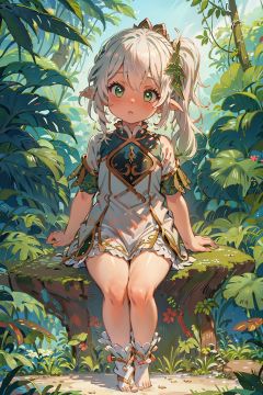 detailed illustration, kusanali,kid, white hair,white dress, green eyes,hair ornament, blush, full body, scenery, jungle ,32,高清, , ,new_blue_b