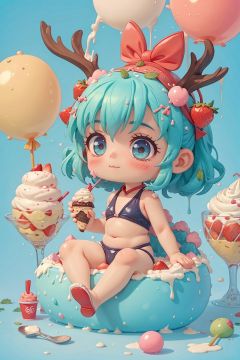 masterpiece,a tiny blue haired girl child sits cross-legged in the middle of an impossibly large ice cream sundae bowl,multi-colored scoops of ice cream piled high around her, swirls of vivid pistachio, strawberry and mint chip sauce drizzle down the sides,cool swimwear, a menagerie of ice cream balloons in rainbow hues float around her, caught mid burst, the little girl gazes into the distance with dreamy expression, captivated by her sugary wonderland, captured with wide angle telephoto lens to show huge scale of ice cream bowl relative to tiny subject, washed in warm pastel colors that glow against the rich cobalt of her hair,1girl,chinese clothes,Dragon ear,deer ear,full body,QRobot,chibi,nijistyle,cute_swimsuit,diives,nop,pixar,children
