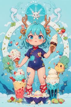 masterpiece, ice cream sundae bowl, blue haired girl child, multi-colored scoops of ice cream, pistachio, strawberry, mint chip sauce, cool swimwear, ice cream balloons, rainbow hues, burst, dreamy expression, sugary wonderland, wide angle telephoto lens, huge scale, pastel colors, cobalt hair, 1 girl, Chinese clothes, Dragon ear, deer ear, full body, QRobot, chibi, nijistyle, cute swimsuit, Diives, nop, Pixar, children.