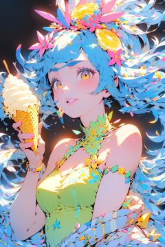 1girl, holding ice cream in her hand, with excellent detail handling,A glass of lemon juice in the background,Handle hand details in place,nijistyle,MG tian, <lora:EMS-3106-EMS:0.5>, <lora:EMS-4020-EMS:0.8>