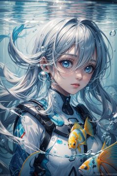 abstract background,(illustration:1),masterpiece,best quality,detailed face and eyes,1 girl,underwater hair physics,air bubbles,light coming through water,reflections,laying in water,split layers of water,school of fish,beauty,