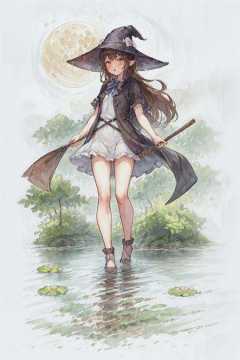 masterpiece, best quality,1girl,adjusting clothes,adjusting headwear,basket,blush,bow,bowtie,breasts,brown eyes,brown hair,cloak,cloud,cloudy sky,crescent moon,dress,fantasy,flower,full body,glowing,glowing flower,hat,light particles,lily pad,long hair,looking at viewer,moon,moonlight,mountain,mountainous horizon,night,outdoors,parted lips,pointy ears,pond,sky,small breasts,staff,star (sky),starry sky,very long hair,wading,water lily flower,wicker basket,wind,witch,witch hat, tachi-e, white background, full body, border, outside border
