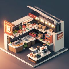 a small model of a food stand with a food cart and a counter top with food on it and a light on, Chippy, isometric, a 3D render, photorealism