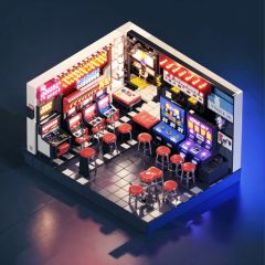 Convenience stores, arcade halls, toy stores, balloons, colored lights, ribbons, game machines, stage lighting, amusement facilities, bumper cars,xx, curtains miniature scene, isometric view, orthogonal, chandelier,masterpiece,best qualityAmazing,atmosphere,epic,3d,8k,