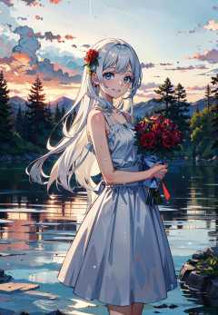 masterpiece,best quality, ((cry|smile):1.2),1girl, bare shoulders, white hair, blue eyes, very long hair, grin, bouquet, day, dress, flower, holding, holding bouquet, lake, looking at viewer, nature, outdoors, red flower, rose, solo, standing, tree, water, water drop, waterfall, wet, sky, cloudy sky, building, sun,