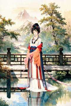 shukezouma,(illustration:1.1),(best quality),(masterpiece:1.1),(panorama shot:1.3),(full body:1.25),(solo:1.2),highres,(ink splashing),(color splashing),(watercolor),mountainous horizon,1girl sitting, garden,bridge,river,reflection, bonian,ru_qun,hanfu,hanfugirl,white shirt, white skirt,looking behind, make happy expressions,soft smile,pure,beautyfull detailed face and eyes,normal breastsblack hair,black eyes,