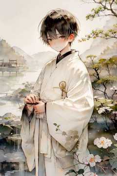 doukou,1boy,white hanfu, beauty, outdoors, lakes, Hangzhou,looking at viewer