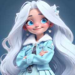 1girl, long hair, freckles, blue eyes, earrings, jewelry, solo, skirt, looking at viewer, crossed arms, white hair, smile, very long hair,star hair ornament, jacket, lips, simple background