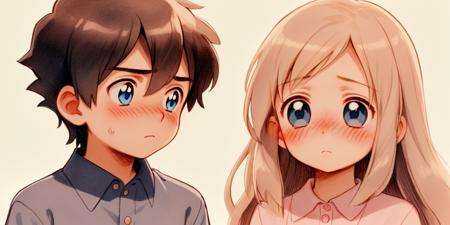 portrait, 1girl, 1boy, long hair, blush, looking at another, blue eyes, eye contact, short hair, hetero, male child, shirt, collared shirt, closed mouth