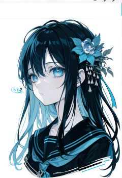 (official art,unity 8k wallpaper,ultra detailed,High quality,best quality), (zentangle, mandala, tangle, entangle:0.6),(blue black),flat color,limited palette,low contrast,(1girl:1.5),solo,serafuku,long straight black hair,lycoris flower,(goat skull:1.),(horror),(gloomy),(blue pigment:1.33),(hollow eyes:1.),(expressionless eyes:1.3),cowboy shot,