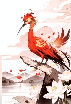 (Chinese girl:1.35),((red and yellow:0.85) but Limited palette:1.2),//,Chinese architecture,Ink,hair flowers,bamboo forest,bamboo,//(long hair),white hair,(loli),small breasts,upper body,smile,((phoenix)),fire,(makeup,red eyeliner),red eyeshadow,red eyes,(long eyelashes),half-closed eyes,peacock skirt,growth,leaf,tree,branch,peacock feathers,bare shoulders,bare legs,(chinese knot),( ink painting, ink splashes, ink wash),cloudy,cirrocumulus,mountains,lake,Chinese style architecture,(Yellow Crane Tower),chinese_trees,branch,(plum blossom),(lotus),petals,sitting