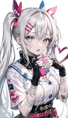 1girl, bandages, bandaid, bandaid_on_arm, bandaid_on_face, bandaid_on_nose, bangs, bow, broken_heart, eyebrows_visible_through_hair, fingerless_gloves, gloves, hair_ornament, hairclip, heart, heart-shaped_pupils, heart_hair_ornament, long_hair, looking_at_viewer, solo, symbol-shaped_pupils, twintails