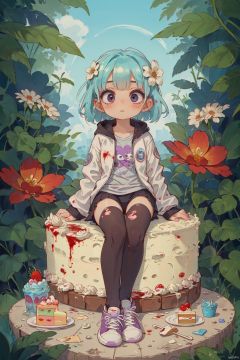 Masterpiece, best_quality, concept_art, 1 girl, solo, cool, summer, ice cream white_hair, long_jacket, summer hot, have your sweetest purple_eyes, purple_liquid, wand, partly_bangs, hair_between_eyes, sneakers, black_legwear, ((cute, cake, summer hot, flouting_eyeballs, blood)), 32k, kids, high definition, real, have your sweetest new_blue_b