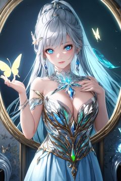 ((masterpiece)), (realistic),(3d face),illustrations,(solo:1.2),(original),(very detailed wallpaper),photographic reality, very detailed illustrations, (super-complex detail),(delicate face),perfect detail features,perfect detail,(super complex details),1girl,mid shot,(otherworldly:1.2), (ethereal:1.2), (shimmering:1.2), (luminous:1.2), (intricate:1.2), (crystalline:1.2), (translucent:1.2), (multifaceted:1.2), (mirrored:1.2), (silver:1.2), (platinum:1.2), (pearlescent:1.2), (glittering:1.2), (mesmerizing:1.2), (mystical:1.2), (haunting:1.2), (hypnotic:1.2), (enchanting:1.2), (futuristic:1.2), (floating:1.2), (levitating:1.2), (illuminated:1.2), (iridescent:1.2), (radiant:1.2), (lustrous:1.2),The woman stood in front of the mirror, her delicate face reflecting the shimmering, luminous surroundings of the mirror world. She wore a silver, pearlescent dress that glimmered in the mesmerizing light. Her hair was intricately styled in a platinum updo, with a few strands of iridescent colors adding to the hypnotic effect. The woman's eyes glowed with a haunting, otherworldly energy as she gazed into the mirror. She held a multifaceted mirror in her hand, and the reflection seemed to show a different version of herself. As she lifted her free hand, a translucent, mirrored butterfly appeared, floating above her hand. The butterfly emitted a hypnotic, enchanting light, illuminating the intricate details of the mirror world around her.,graphic design,4k detailed post processing, atmospheric, hyper realistic, 8k, epic composition, artstation,intricate details,32k,高清,32