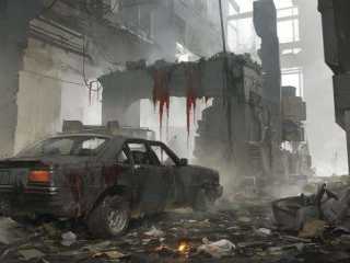 masterpiece,best quality,sandstorm,gloomy,sutu,blood,Waste,scrapped car,Burning garbage,no humans,